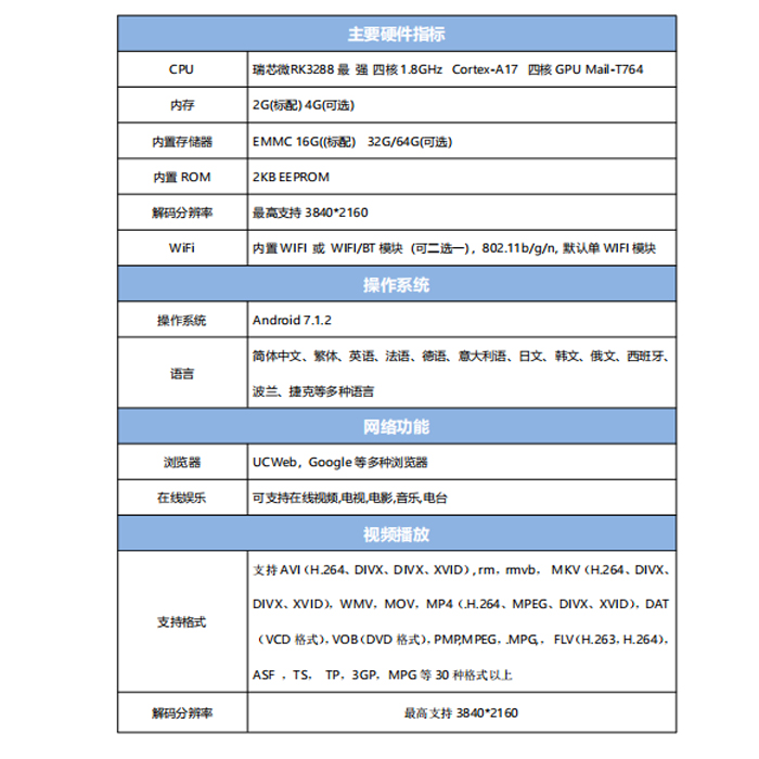 本产品搭载了 Android 7.1 的操作系统,标配 2G 的 RAM 和 16G 的 EMMC ROM