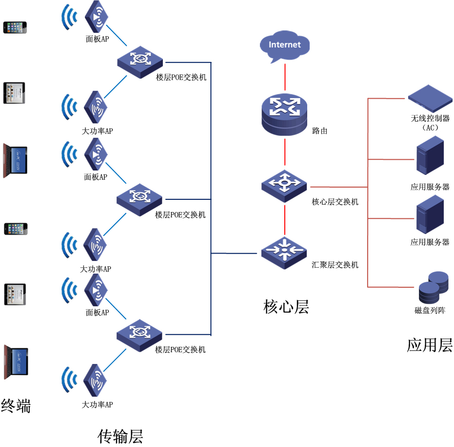 本方案中的传输层主要由楼层汇聚交换机、POE交换机、无线AP共同组成,楼层汇聚交换机负责底端POE交换机数据汇聚,POE交换机起到数据转发、供电功能,无线AP主要释放SSID,提供无线接入信号。